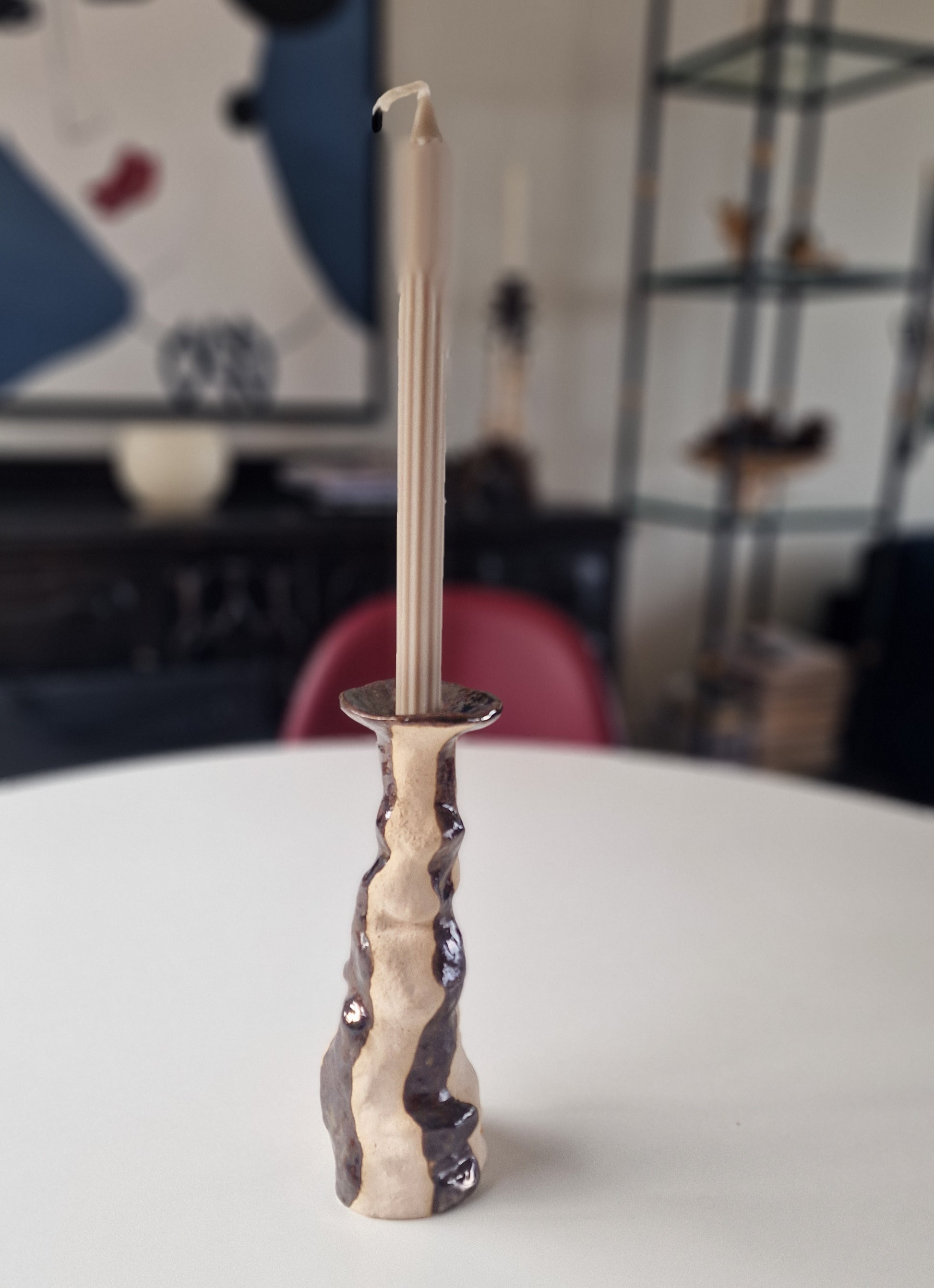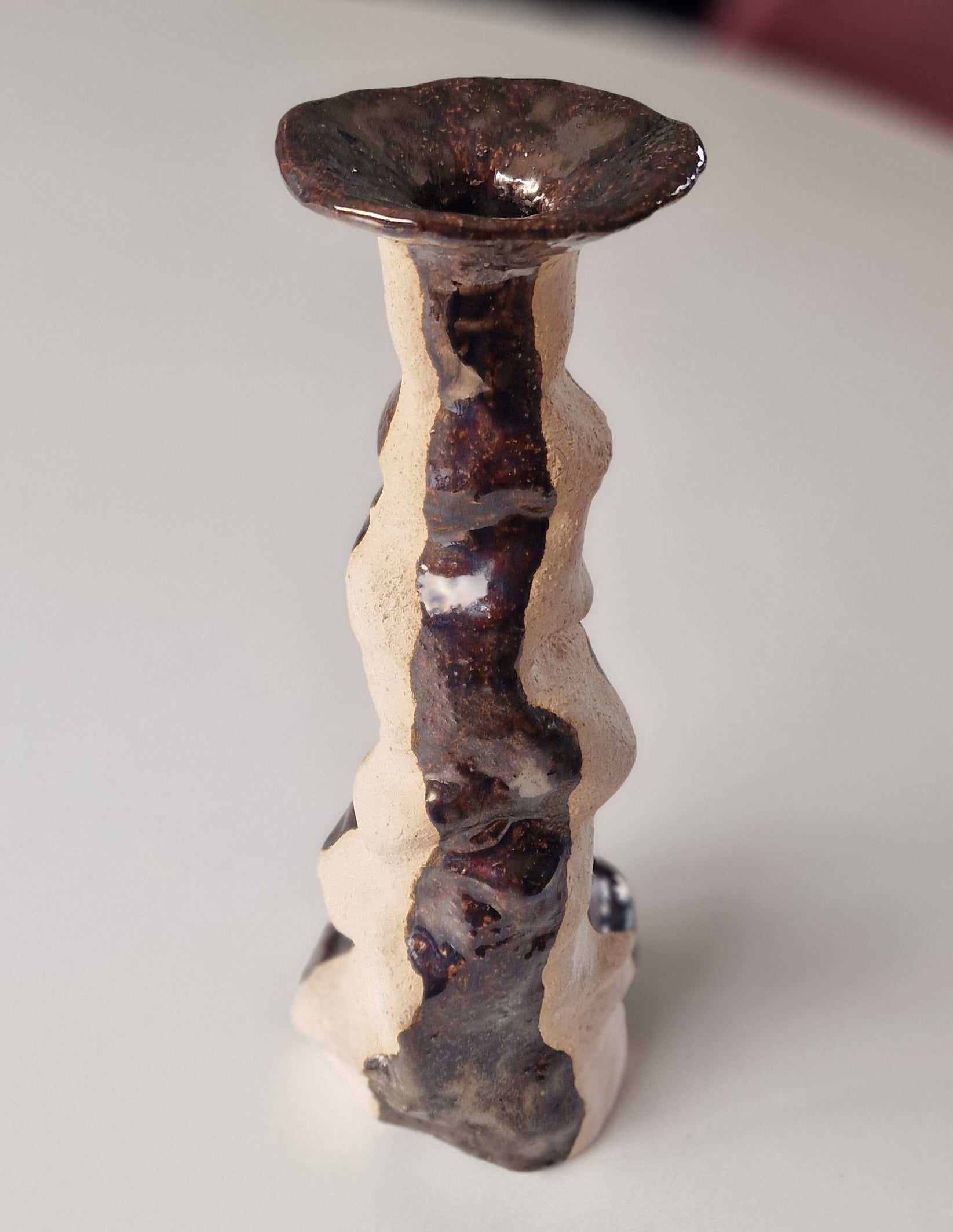 "Querky" lysestake i keramikk med brun gloss glasur - 19cm i diam. og 10cm høy.